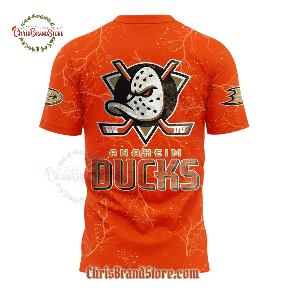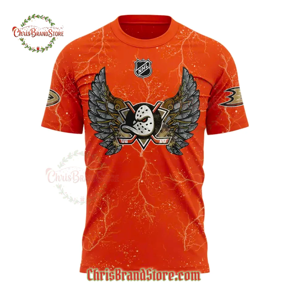 This isn’t just an orange t-shirt; it’s an electric, visual symphony dedicated to the Anaheim Ducks T-Shirt legacy. The designers clearly set out to capture the raw, unbridled energy of game night, and you can see it in every detail. Your eye is immediately drawn to that vibrant, almost scorching orange hue. It’s not just a color; it’s the very heartbeat of the Ducks, the fire in every play, the bold statement of dedication. What truly sets it apart, though, is that incredible white “lightning” pattern that streaks across the entire fabric, front and back. It gives the shirt this dynamic, almost crackling energy, like static electricity before a big hit. It’s a subtle yet powerful texture that elevates the whole piece.