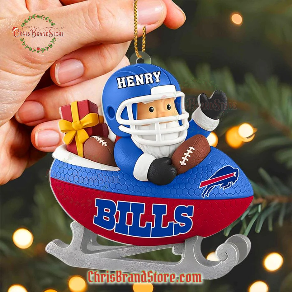 Then you catch the mini football player, tucked into his bobsled, complete with a tiny Santa-like white beard that adds just the right touch of holiday charm. He’s wearing a classic blue helmet, and what truly elevates this design is the crisp, clear personalization of any name right there on the helmet. It’s commanding, yet personal. He’s got one football tucked under his arm, ready to go, and another, along with a perfectly wrapped gift, nestled in the sled beside him. It’s like he’s delivering all the best parts of the season, Bills-style. The silver sled runners give it that classic winter sleigh vibe, contrasting beautifully with the dynamic red and blue. Even the “BILLS” lettering at the front is bold and unmistakable, anchoring the entire design with that undeniable team spirit. This personalized ornament communicates pure, unadulterated fan joy, making you feel connected to every exciting game and festive moment.