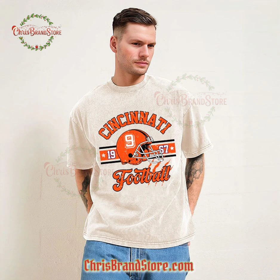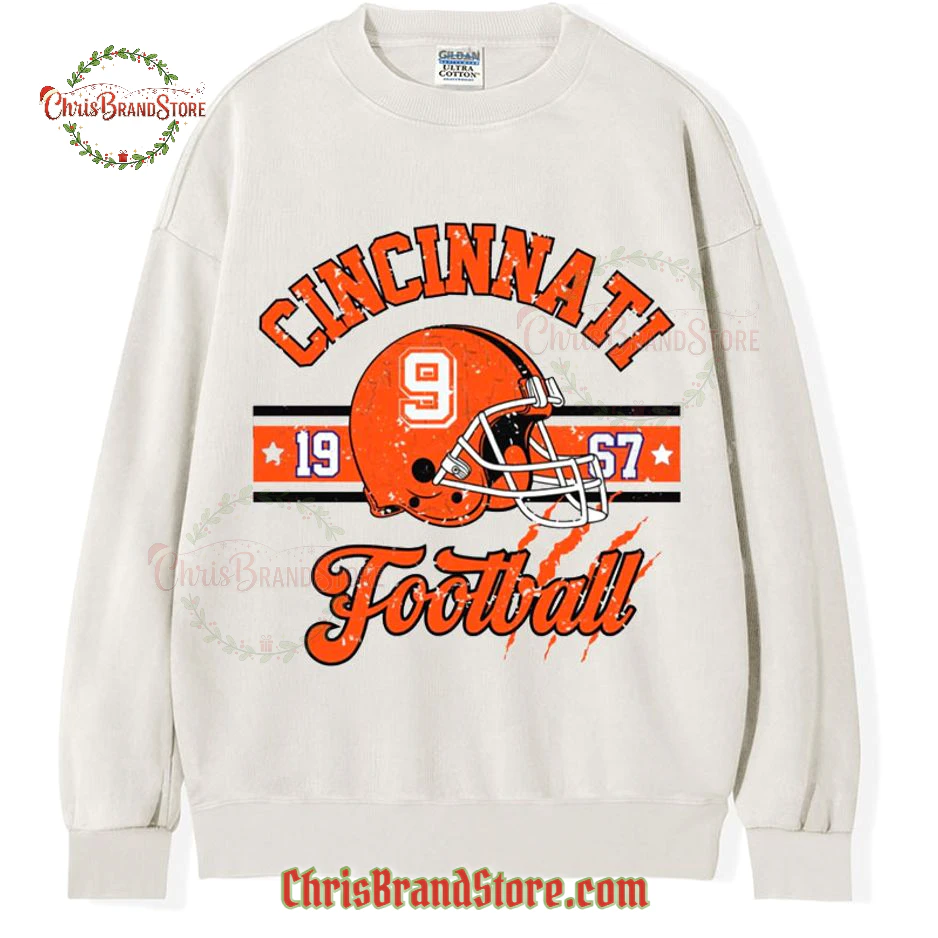The first thing that catches your eye is the iconic football helmet, proudly displayed with the number 9. It’s got that classic, no-nonsense design that just screams gridiron action. Above it, “CINCINNATI” arches in a bold, collegiate-style font, balanced perfectly by “Football” in a cool, slightly distressed script underneath. And those details! Flanking the helmet are the years “19” and “67”, punctuated by small stars that add to the old-school athletic vibe. You can even spot those subtle claw marks across the lower portion, a brilliant touch that hints at the fierce spirit of the game. It’s a design that’s both bold and nuanced, celebrating a significant year without being overly flashy. The graphic itself feels substantial, not flimsy, suggesting it’ll hold up to countless washes and wears, just like a true vintage find should.