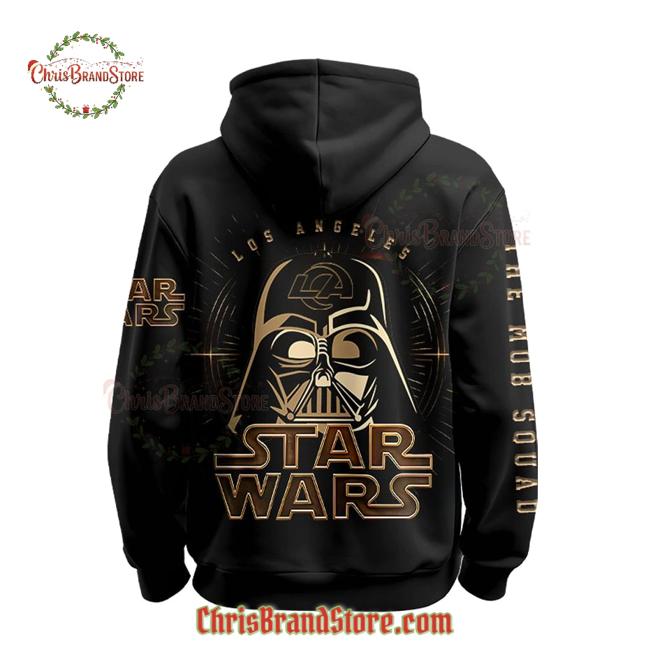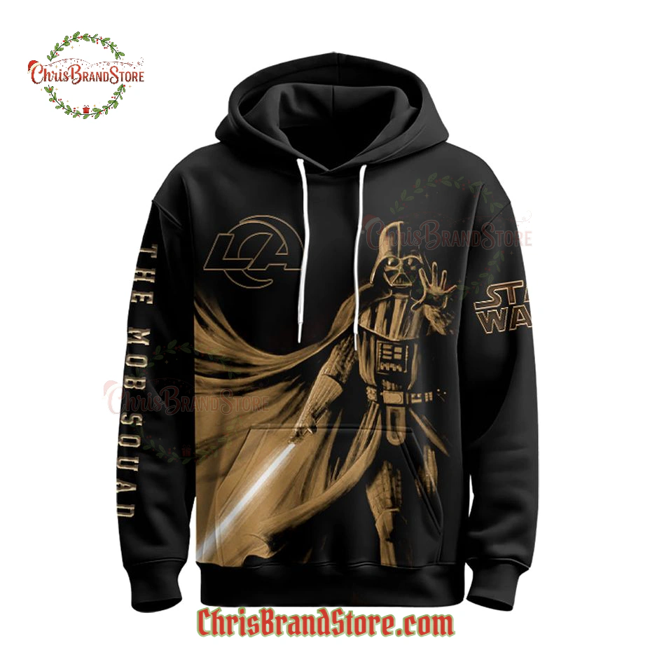 Then you notice the details. The classic “STAR WARS” logo is prominent, rendered in a matching gold tone that adds to that premium feel. On the right chest, there’s a subtle yet clear Los Angeles Rams logo in gold, perfectly integrating the team spirit without overwhelming the Star Wars theme. And running vertically down the left sleeve, you’ll find “THE MOB SQUAD” – a fantastic nod to dedicated Rams fans. It’s those little touches that really show the thought put into this piece, making it instantly recognizable to fellow enthusiasts. The fabric itself feels soft but substantial, hinting at the comfort and durability you’d expect from quality fan gear. Every line, every color choice, works together to communicate power and loyalty.