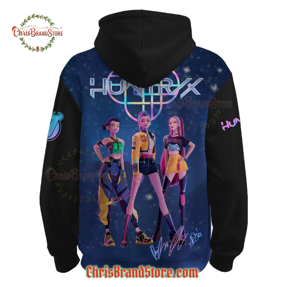 Then, the back of this New Jersey Devils hoodie. It’s a total reveal. The “HUNTRX” title is sleek, modern, almost digital, sitting above the fearless Kpop Demon Hunters themselves. Each character is rendered in crisp detail, radiating confidence and style, making this a true Kpop Demon Hunters hoodie. The starfield background continues here, giving a sense of depth and endless possibility, while subtle signatures add that exclusive touch. Even the repeated gradient Devils logo on the sleeves reinforces that this isn’t just a collaboration; it’s a seamless integration. Every line, every color choice, speaks to a design that’s confident, unforgettable, and truly unique.