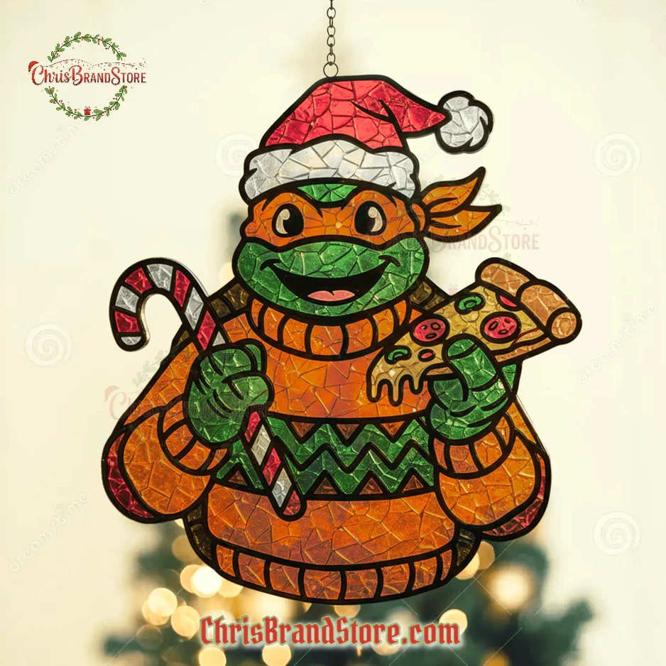 What really gets me about this piece is how much personality they packed into one festive package. They didn’t just slap a Santa hat on a Ninja Turtle; they truly captured Michelangelo’s spirit with a holiday twist. Your eye lands first on that unmistakable, vibrant green skin, contrasting perfectly with his bright orange mask, giving him that classic, ready-for-anything look. Then you catch the genius: it’s all rendered in this incredible “stained glass” mosaic effect. Every piece of color, from his cheerful green face to the bright red and green of his cozy-looking ugly Christmas sweater, is individually patterned to give it depth and a beautiful, shimmering quality when the light catches it. It’s not flat; it’s alive.