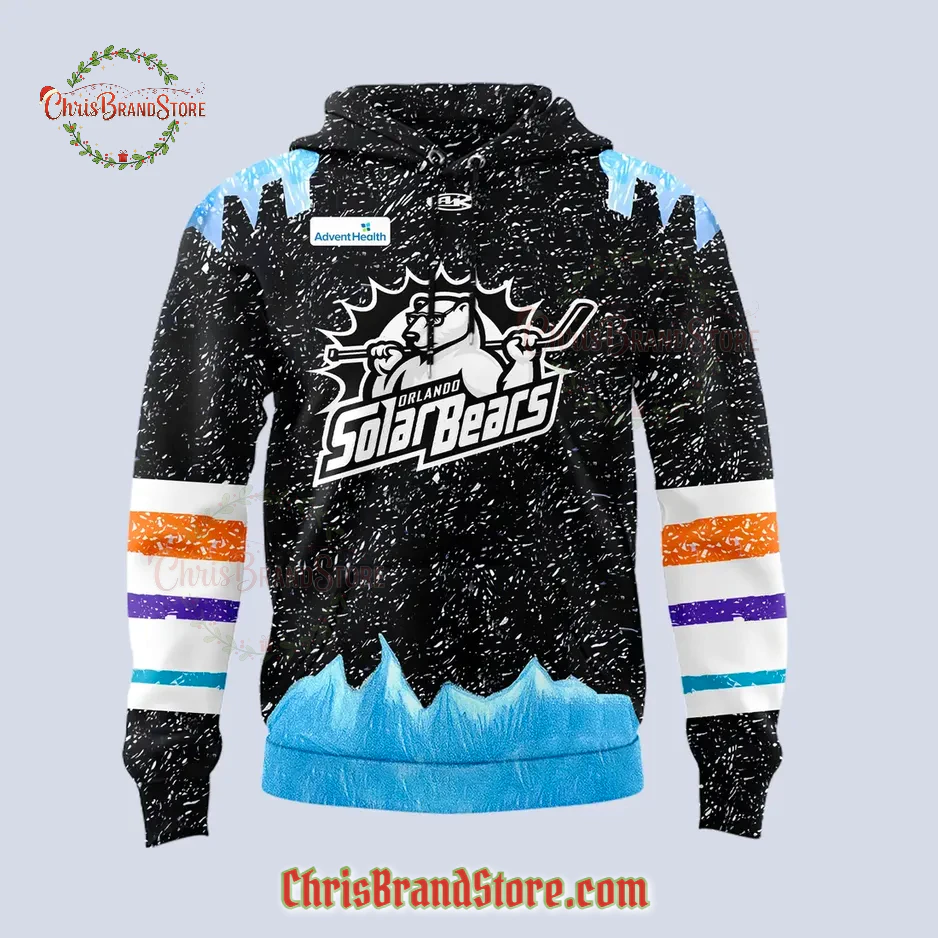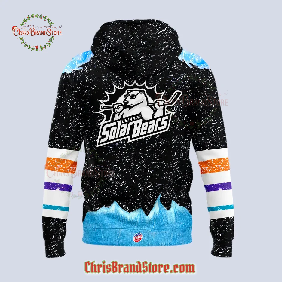 What really pops against that textured backdrop is the iconic Orlando Solar Bears logo, perfectly centered. The bear itself looks ready for action, and the bold, striking typography for “Solar Bears” commands attention, framed beautifully by “Orlando” above. Look closer, and you’ll notice the brilliant use of color. The crisp white of the logo truly shines, while the vibrant orange and the cool teal, along with subtle hints of purple on the sleeve stripes, connect directly to the team’s legacy and energize the entire piece. That light blue isn’t just a color; it’s the essence of ice, giving a refreshing, dynamic contrast. The way the bottom hem of the hoodie transitions into that jagged, almost sculptural light blue ‘ice drip’ effect is pure genius – it feels like you’re literally wearing a piece of the frozen action. Even the subtle ice shard graphics on the shoulders, they’re just another detail that screams thoughtful design. This is a design that doesn’t just display a logo; it celebrates it with flair and artistic intention.