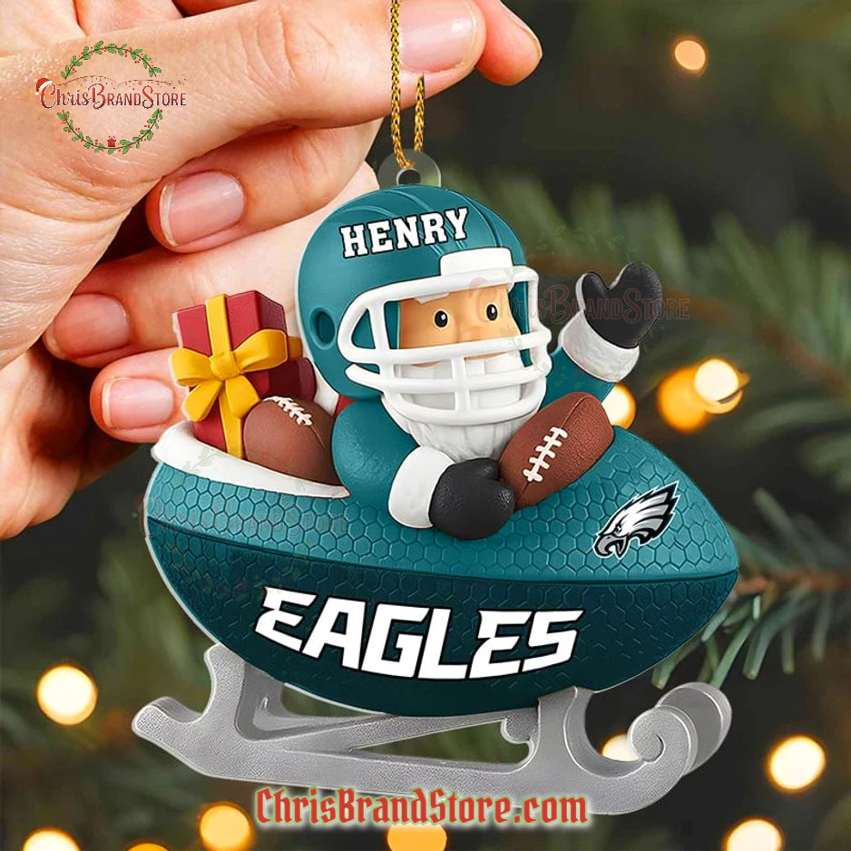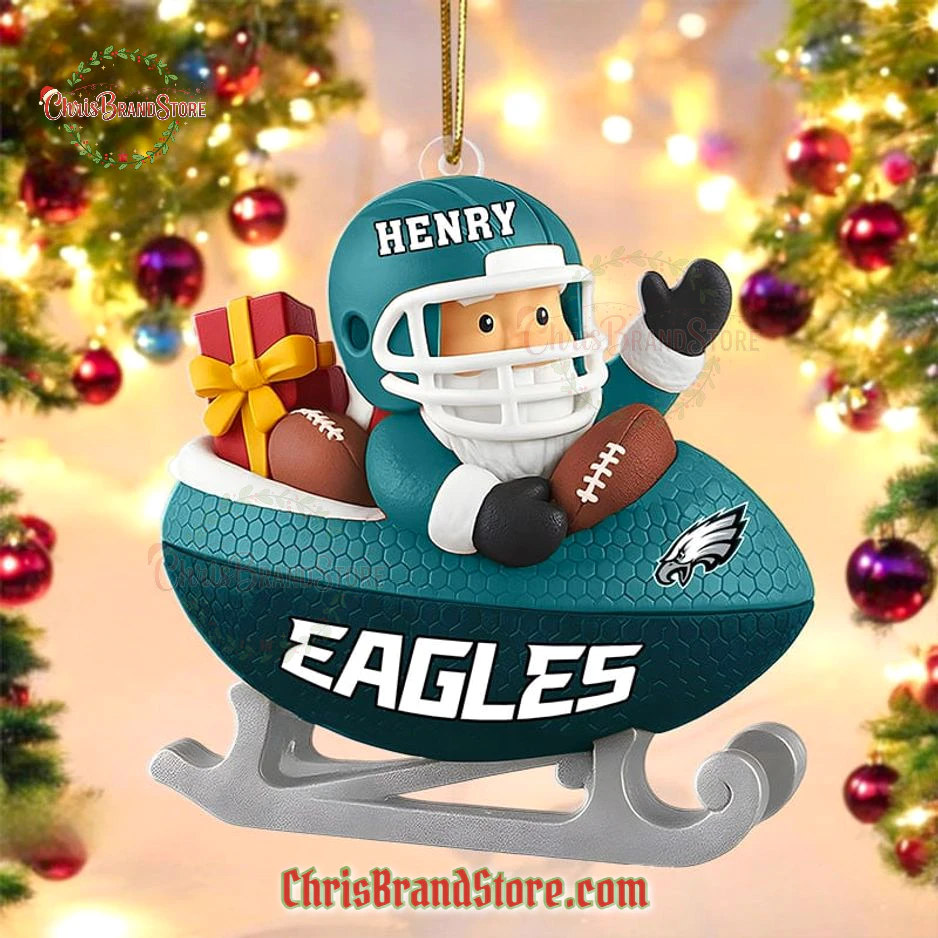 Then you start to notice the details. The little figure, dressed head-to-toe in team colors, helmet on, waving enthusiastically, a miniature football clutched in its hand. What makes it genuinely special is that “HENRY” emblazoned across the helmet – a fantastic touch that makes this ornament feel incredibly personal, ready for your name or the name of a loved one. Look closer, and you’ll see the sleigh itself is shaped like a football, complete with that distinct textured pattern, making it unmistakably tied to the game. It’s a clever, playful design choice that elevates it beyond just a flat image. Inside the sleigh, nestled beside the helmeted figure, are two more tiny footballs and a perfectly wrapped gift, reminding you of both the holiday spirit and the gifts of game day excitement. The crisp white lettering of “EAGLES” stands out boldly on the side of the sleigh, anchored by the iconic team logo. It’s a design that’s full of personality, communicating fierce devotion with a joyful, festive flair.