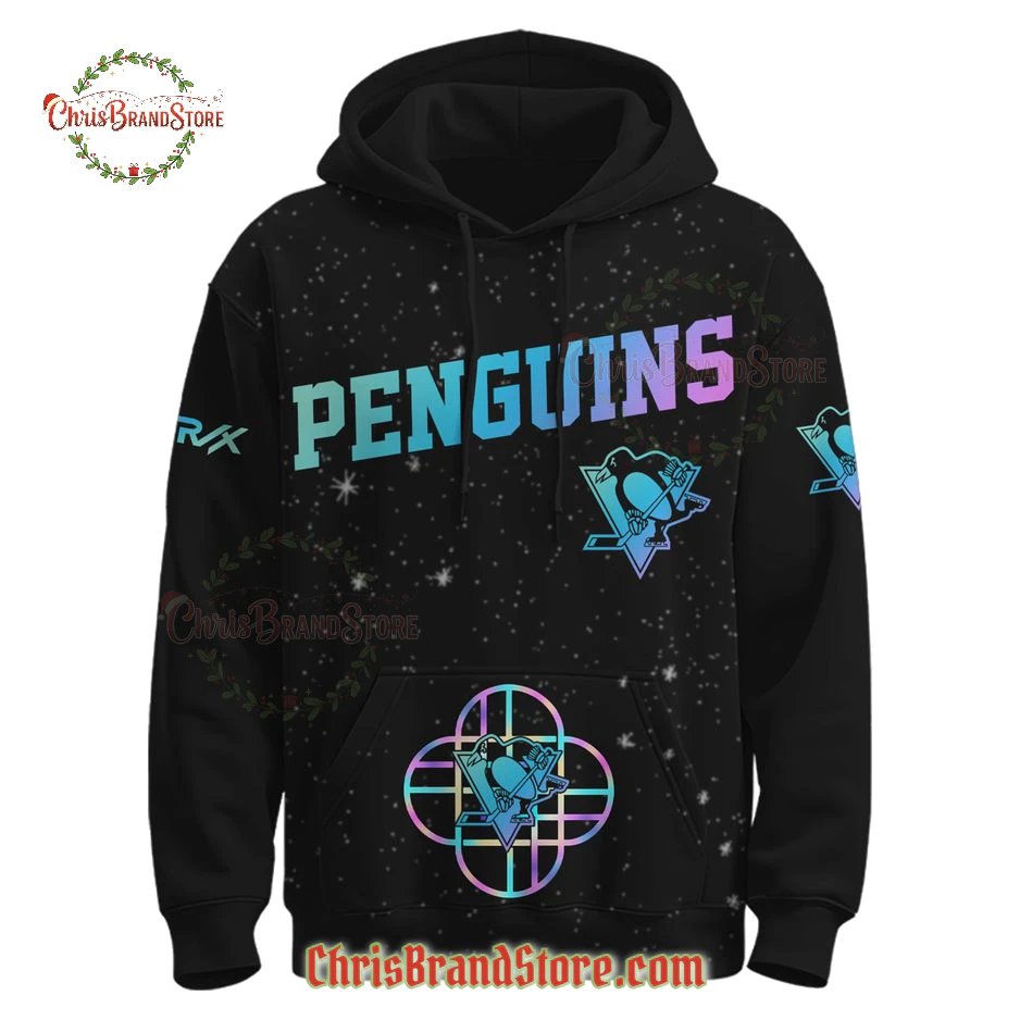 These thoughtful details really elevate it. The deep black base isn’t just a classic Penguins color; it’s the perfect canvas for these vibrant accents, making them truly sing. The fabric character feels just right – a substantial yet comfortable weight. It communicates confidence, a readiness to celebrate both high-stakes puck drops and epic dance breaks. This piece isn’t shouting; it’s confidently stating, ‘I contain multitudes,’ blending worlds with championship-caliber design.