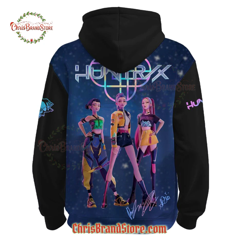 Look at the back – that’s where the Kpop Demon Hunters truly come alive, featured in vibrant, dynamic poses against that cosmic backdrop. The ‘HUNTRX’ text above them, with angular lines, completes the aesthetic. It feels like a concert poster and a championship banner rolled into one. You can even spot subtle signatures, adding authentic fan appeal. It’s that instant connection you get when someone sees you’re fluent in both languages – hockey and Kpop. It’s comfortable, yet stylish enough for any event, from a nail-biting third period to hitting up your favorite record store. Wearing this hoodie isn’t just about showing what you like; it’s about showing who you are and feeling that instant recognition.