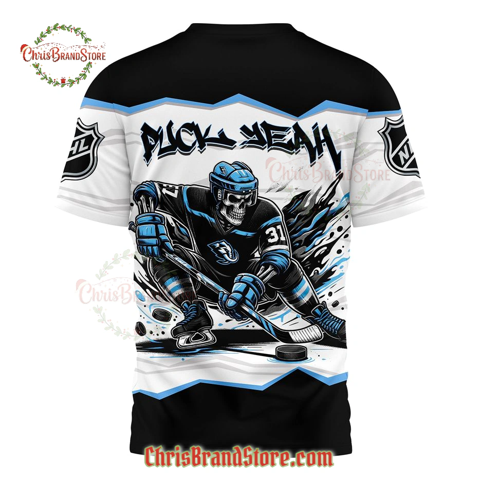 Turning this piece around, the back is where things truly explode with personality. You’re hit with a powerful graphic of a skeleton hockey player, stick in hand, mid-shot, surrounded by a splash of light blue and black streaks that suggest explosive movement and impact. It’s gritty, cool, and perfectly embodies the “Puck Yeah” slogan emblazoned above it – a phrase that just screams enthusiasm and confidence. The way the blue hues really pop against the darker elements and the stark white background creates a fantastic sense of depth, giving this shirt its distinctive 3D feel. Plus, the fabric itself feels smooth and substantial, built to handle game-day excitement or just chilling out.