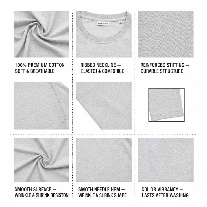 • Sleeve hem and bottom hem with wide double topstitch, comfortable crew neckline.