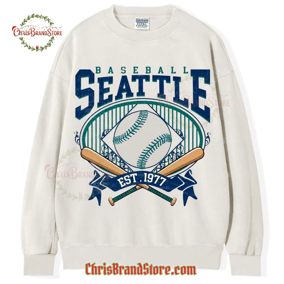 The first thing that catches your eye is the bold “SEATTLE” splashed across the center, sitting proudly over a stylized baseball graphic. Above it, “BASEBALL” arches perfectly, tying the whole theme together. Then you notice the subtle details: the crossed bats at the bottom, perfectly symmetrical, grounding the design. Tucked within a ribbon banner that wraps around the bats, you see “EST. 1977,” a cool historical nod that adds depth and significance. The typography itself feels perfectly era-appropriate – chunky and confident, but with that slightly worn, cracked look that makes it feel like it’s been through a few seasons already. It’s not just a print; it’s a championship-caliber design that tells a story of tradition and hometown pride.